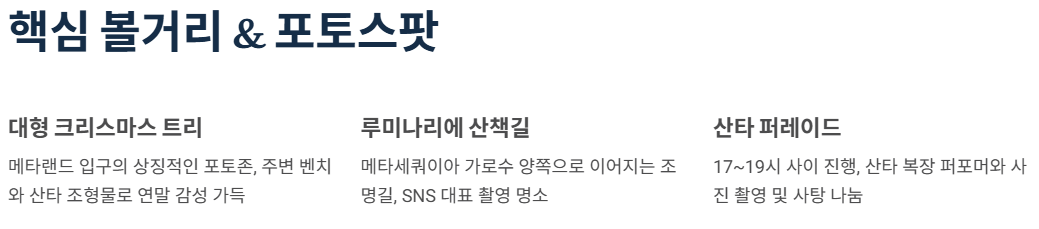 | 주요 테마 | 대형 트리, 루미나리에, 산타 퍼레이드, 버스킹 공연, 어린이 체험 부스 |