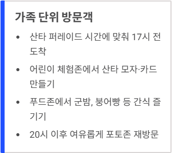 - 산타 퍼레이드 및 공연 시간에 맞춰 메인 무대 주변 이동