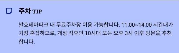| 주차장 | 발효테마파크 내 무료 주차장 운영 |