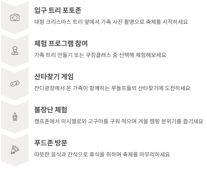 | 주요 테마 | 산타찾기 게임, 쿠킹클래스, 트리 만들기, 플리마켓, 불장난 체험 |