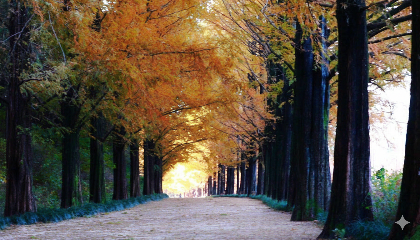 메타세쿼이아길은 단풍이 들면 황금빛 터널처럼 변해 자전거를 대여해 달리거나 가족사진 촬영에도 좋습니다.