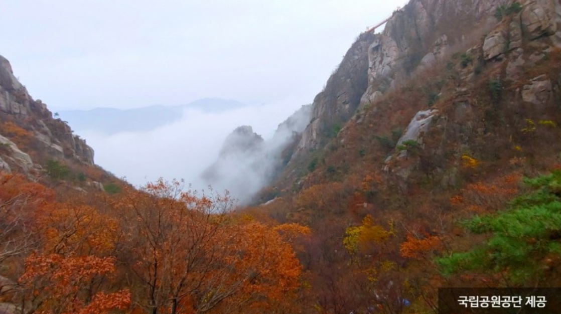 암봉과 단풍이 어우러진 국립공원. 하늘다리와 천황사 코스가 인생샷 포인트!