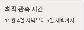 마지막으로, 건강 측면의 준비도 중요합니다. 12월 초 밤 기온은 체감온도로 영하권까지 내려갈 수 있으므로, 관측 시간은 30~60분 이내로 정하고 장갑·목도리·핫팩 등 방한 아이템을 필수로 챙기는 것이 좋습니다. 추위로 인해 중간에 서둘러 들어가게 되면 오히려 콜드문을 여유 있게 감상하지 못한 아쉬움이 남기 때문에, “장소 선정만큼 중요한 것이 방한 준비”라고 기억해 두면 실전에서 실패 확률을 크게 줄일 수 있습니다.