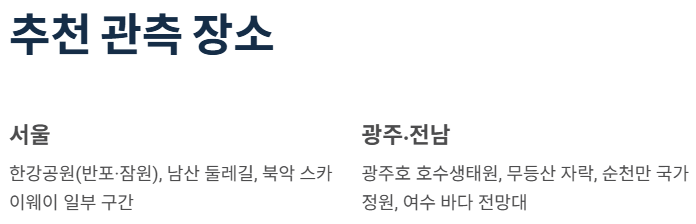 공간 선택도 콜드문 관측의 중요한 변수입니다. 서울은 남산 둘레길·북악 스카이웨이 일부 구간·한강공원(반포·잠원 근처), 광주는 광주호 호수생태원·무등산 자락, 전남권은 순천만 국가정원·여수 바다 조망 포인트처럼 동쪽·남동쪽 하늘이 시원하게 열려 있는 곳이 유리합니다. 바다나 강 근처는 수평선 부근에서 달이 떠오르는 장면을 담기 좋고, 도심 전망대·야경 포인트는 빌딩 숲과 달을 함께 담아 “도시 감성”을 살리기에 좋습니다. 다만, 빛공해가 심할수록 달 주변의 별은 거의 보이지 않기 때문에, “달만 크게 찍겠다”는 목적이라면 도심도 괜찮지만 “별자리까지 함께 보겠다”면 가능한 한 외곽·산책로를 추천합니다.