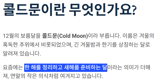 콜드문이라는 이름은 전통적으로 12월의 혹독한 추위에서 비롯되었으며, 긴 겨울밤·한기를 상징하는 달로 알려져 있습니다. 요즘에는 이런 상징성에 “한 해를 정리하고, 다음 해를 준비하는 달”이라는 의미가 더해져, 연말에만 할 수 있는 작은 의식처럼 받아들여지고 있습니다. 특히 캘린더·플래너·다이어리 시장이 피크를 맞는 시기와 겹치면서, 콜드문 날짜에 맞춰 새해 목표를 정리하거나, 버킷리스트를 작성하는 루틴으로 확장하는 사례도 많이 보입니다.