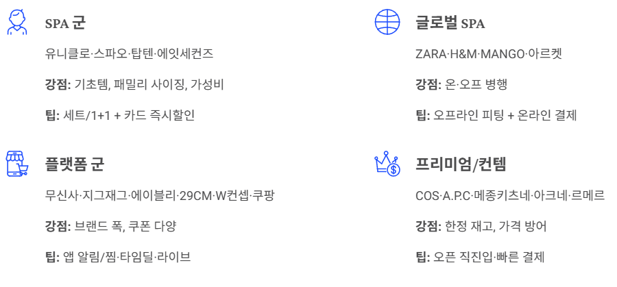| 플랫폼 군(무신사·지그재그·에이블리·29CM·W컨셉·쿠팡) | 브랜드 폭넓음·쿠폰 다양 | 중복할인 규칙·배송속도 | 앱 알림/찜·타임딜·라이브 |
