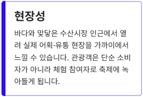 이 축제의 가장 매력은 ‘현장성’입니다. 바다와 맞닿은 수산시장 인근에서 열려 실제 어획·유통 현장을 가까이에서 느낄 수 있으며, 관광객은 단순 소비자가 아니라 체험 참여자로 축제에 녹아들게 됩니다. 또한 대형 공연 위주의 축제가 아니라, 먹거리·체험·장터 중심으로 구성되어 남녀노소 모두 부담 없이 즐길 수 있는 점이 강점입니다.