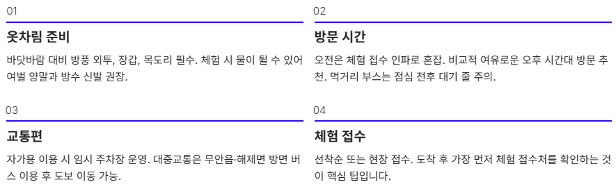 겨울에 열리는 바닷가 축제인 만큼 준비가 중요합니다. 축제장은 바닷바람의 영향을 크게 받기 때문에 방풍 기능이 있는 외투와 장갑, 목도리를 준비하는 것이 좋습니다. 특히 체험 프로그램 참여 시 물이 튈 수 있으므로 여벌 양말이나 간단한 방수 신발이 도움이 됩니다.